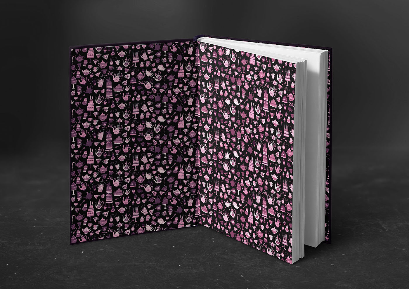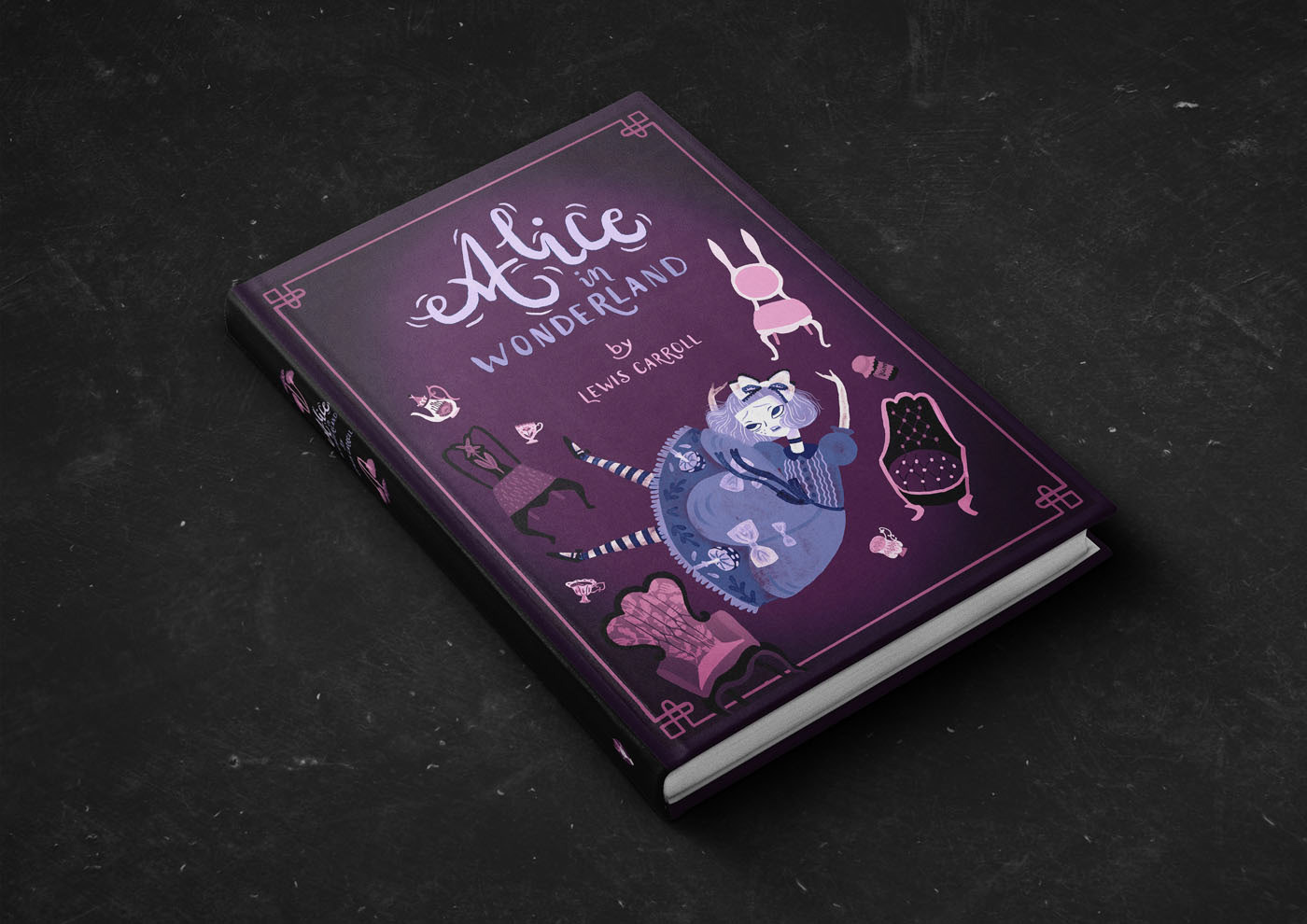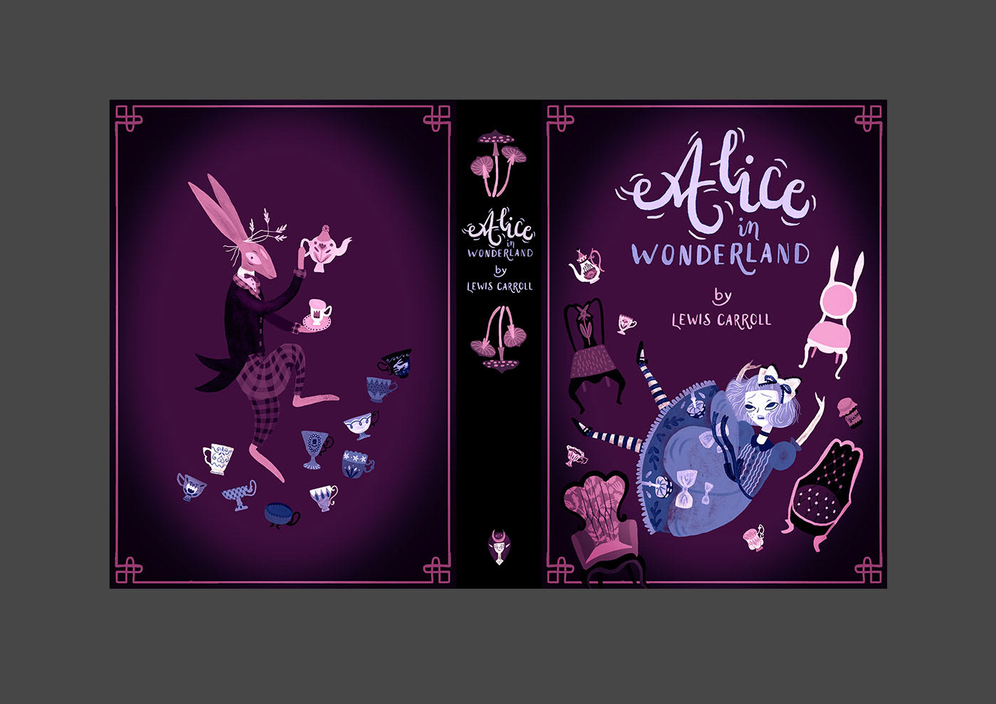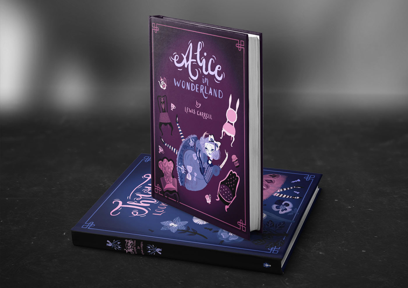 Cover illustrations, lettering and end paper patterns for Lewis Carroll's novels Alice's Adventures in Wonderland and Through the Looking-glass