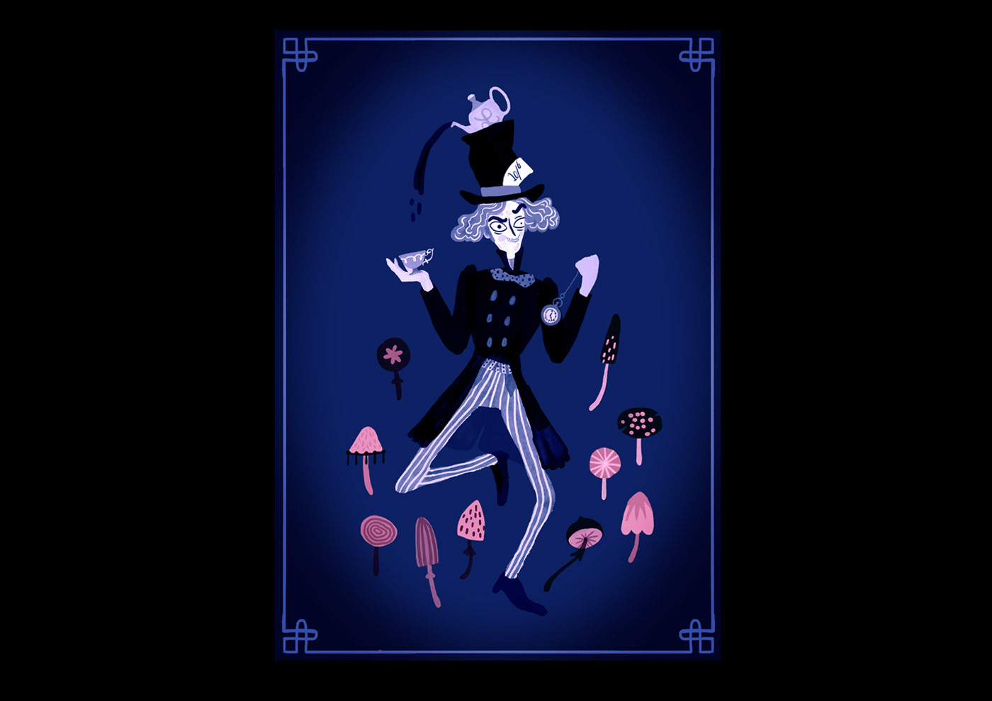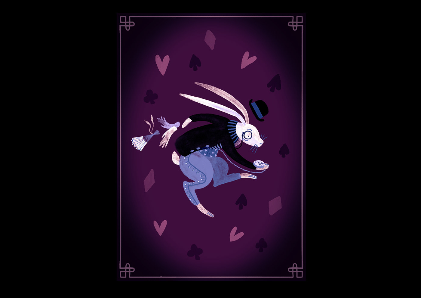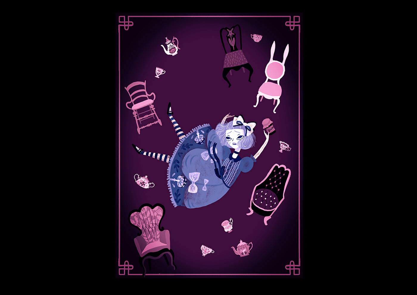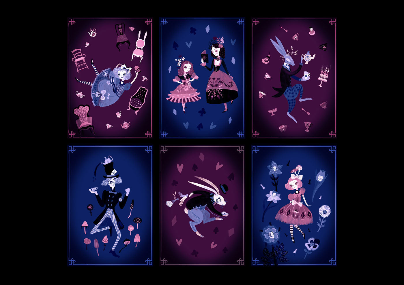 Cover illustrations, lettering and end paper patterns for Lewis Carroll's novels Alice's Adventures in Wonderland and Through the Looking-glass