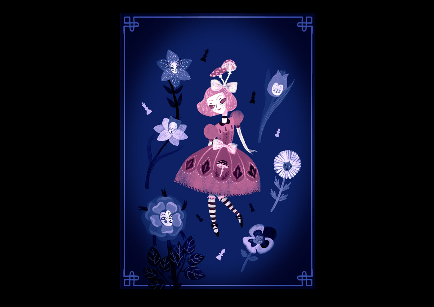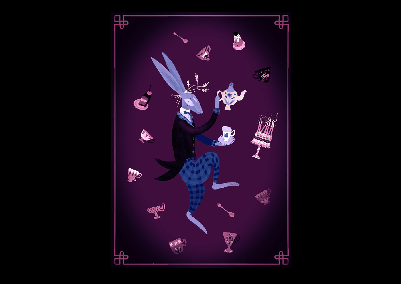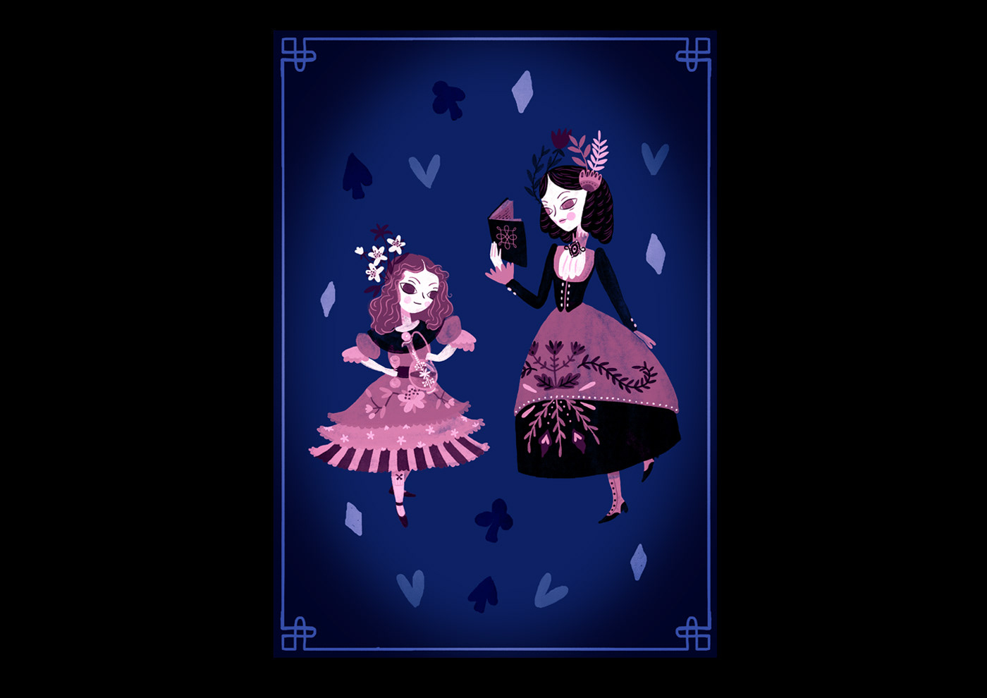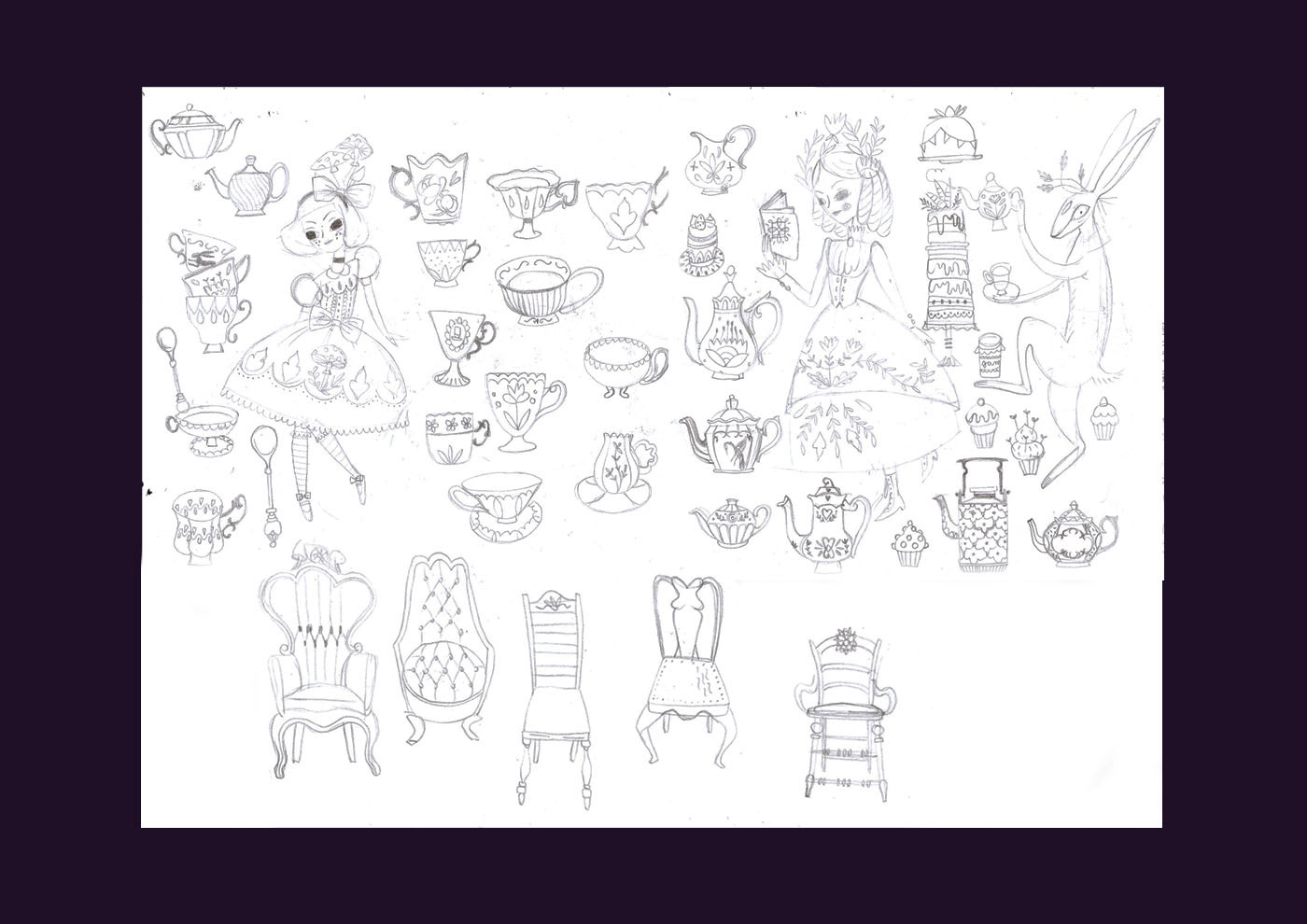 Cover illustrations, lettering and end paper patterns for Lewis Carroll's novels Alice's Adventures in Wonderland and Through the Looking-glass