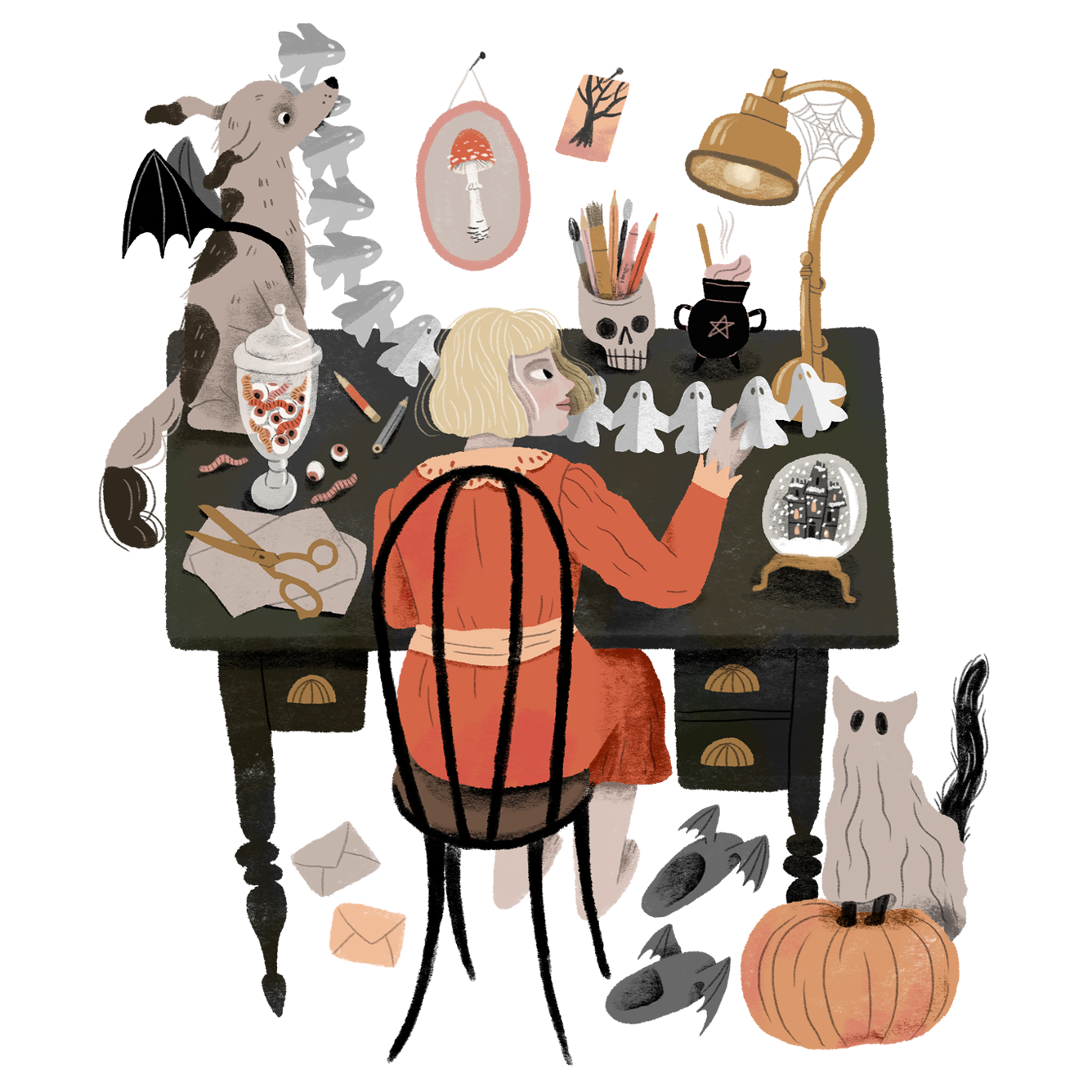 Illustrations for Chilling with Ghosts, a Totally Factual Field Guide to the Supernatural written by Insha Fitzpatrick, published by Quirk Books. Art direction, cover and book design by Andie Reid.