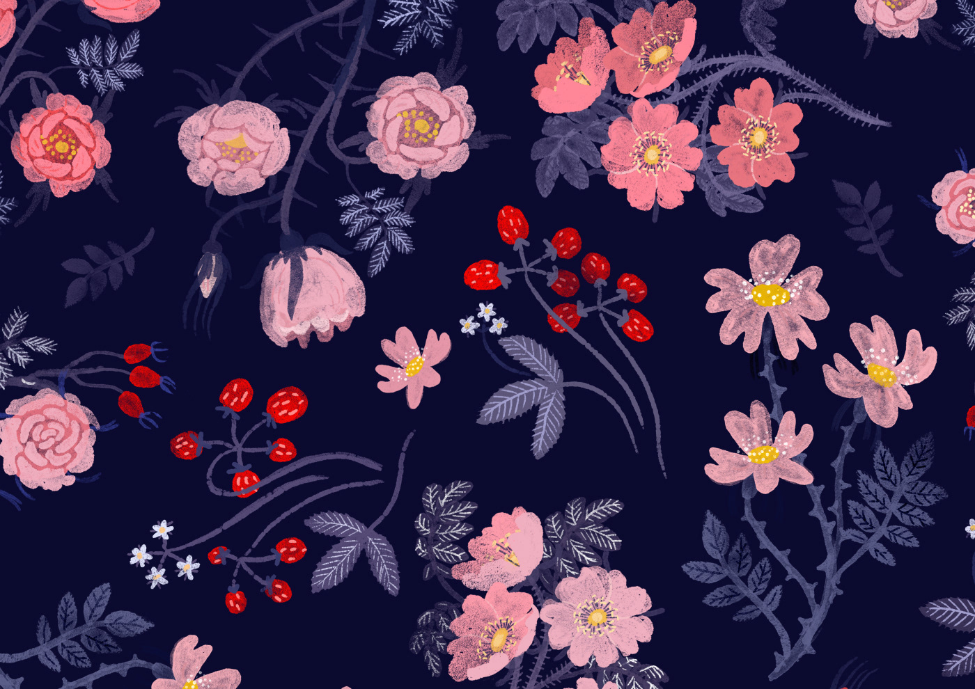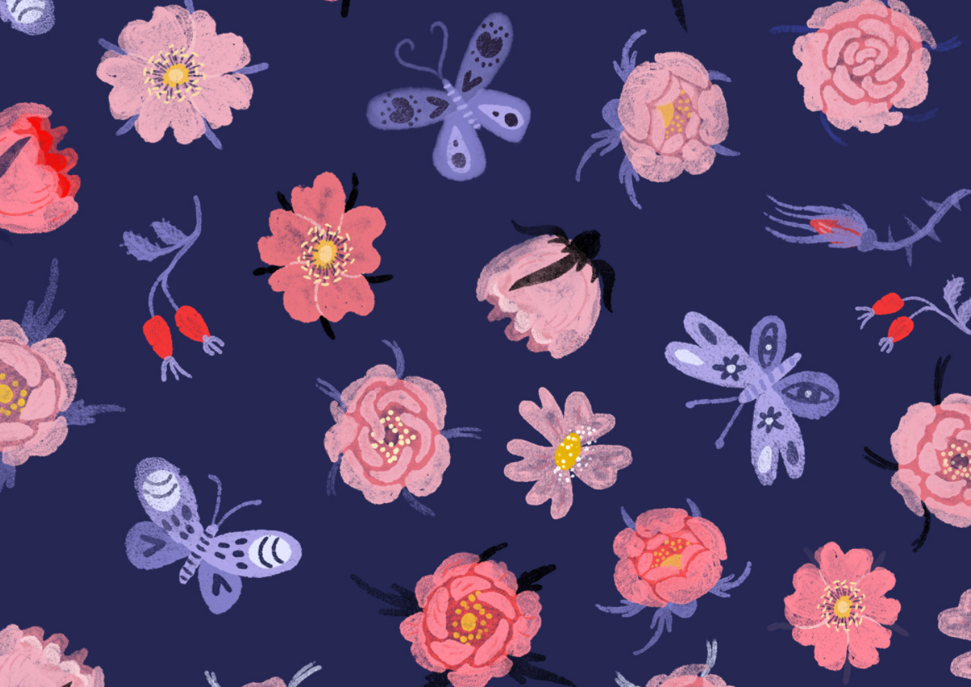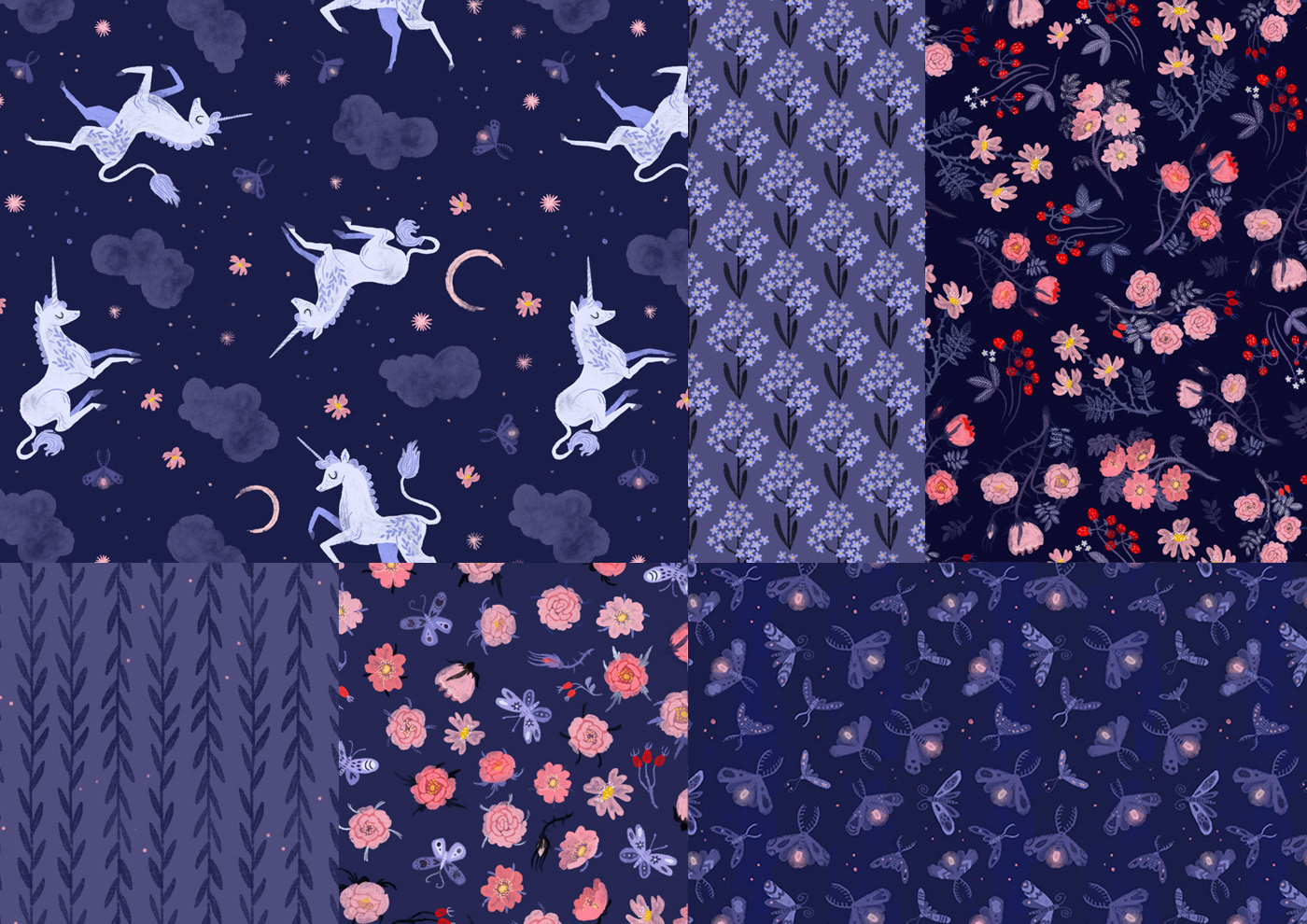 Pattern collection inspired by unicorns, moon gardens and summer nights.