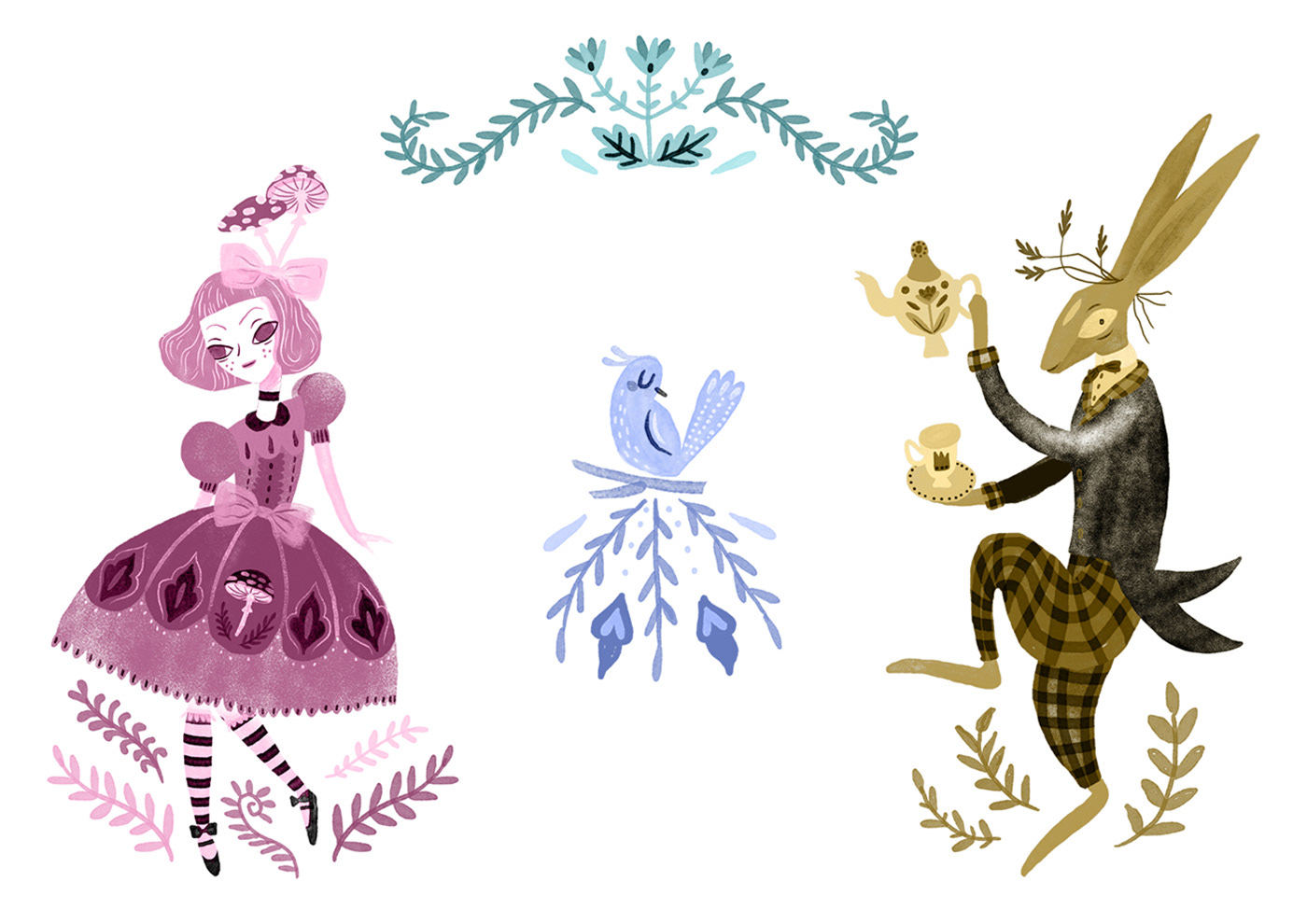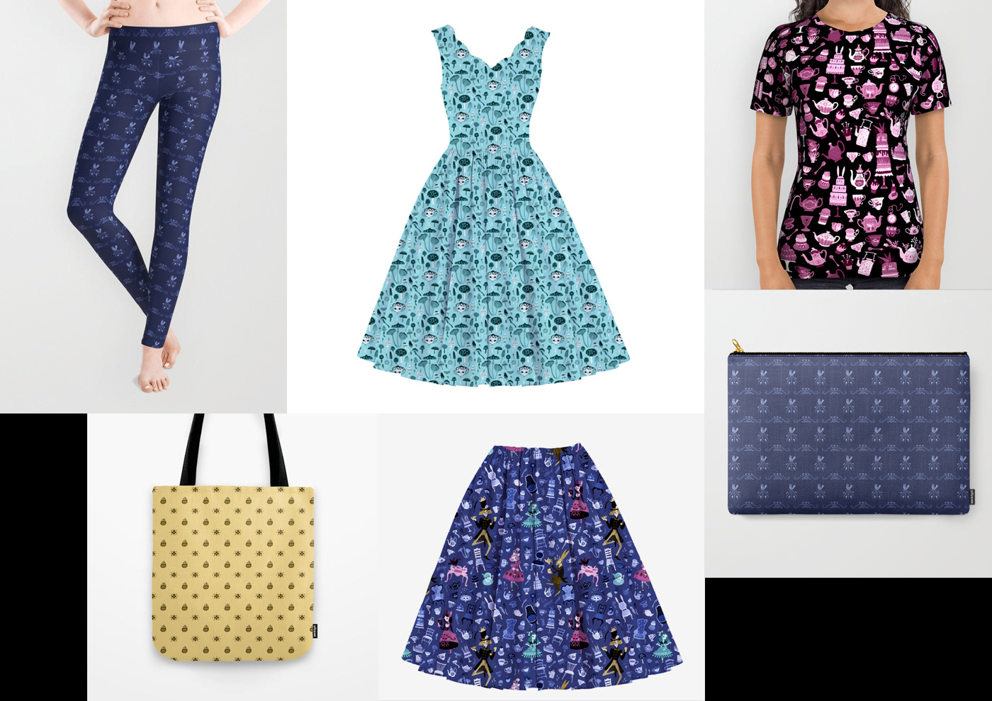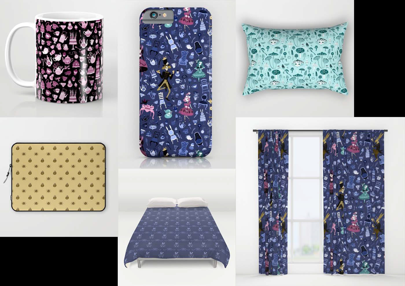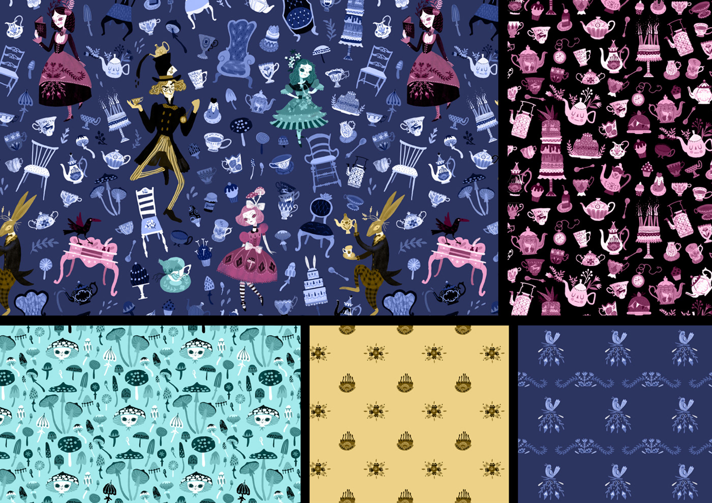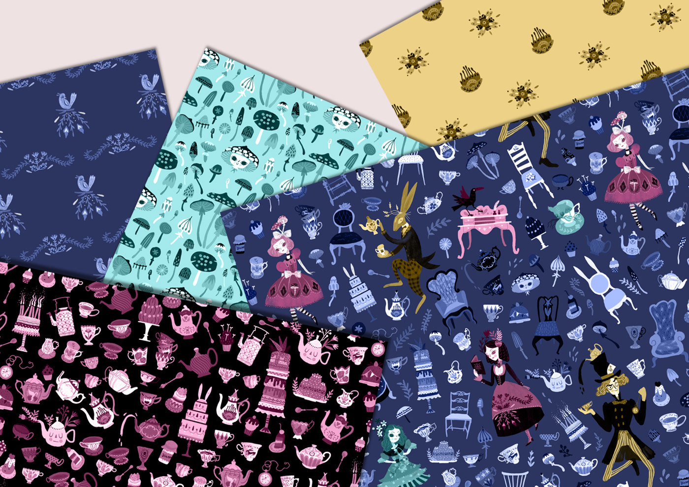 This Alice in Wonderland themed project is a melting pot of many stuff I'm passionate about: pattern design, literature, magic, Victorian era, lolita style outfits and crazy talking animals. It's needless to say that I loved working on it! The collection contains five detailed, illustrated pattern designs in a whimsical vintage style.