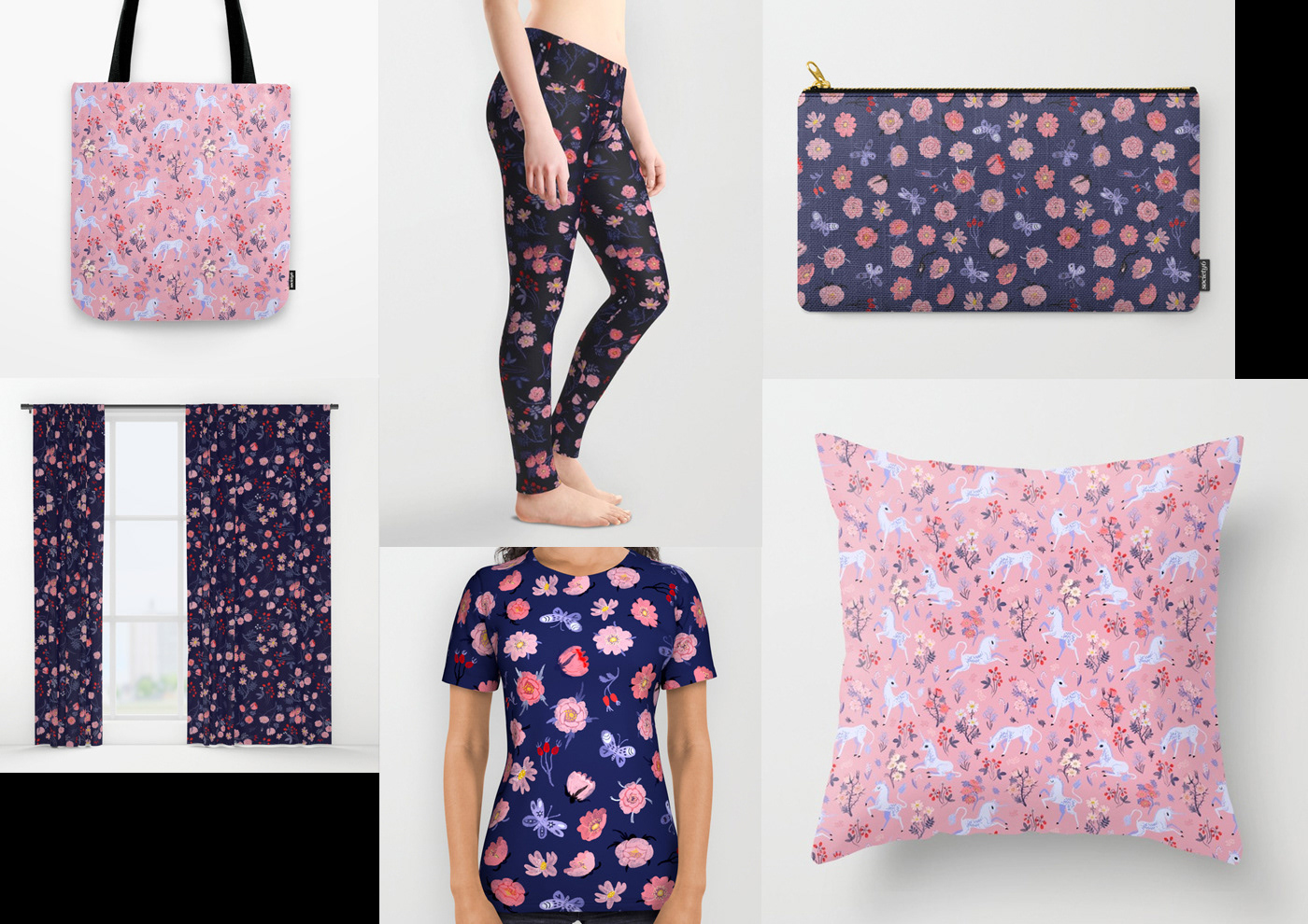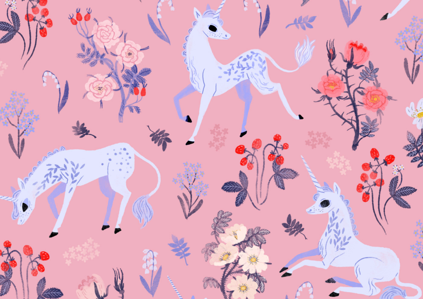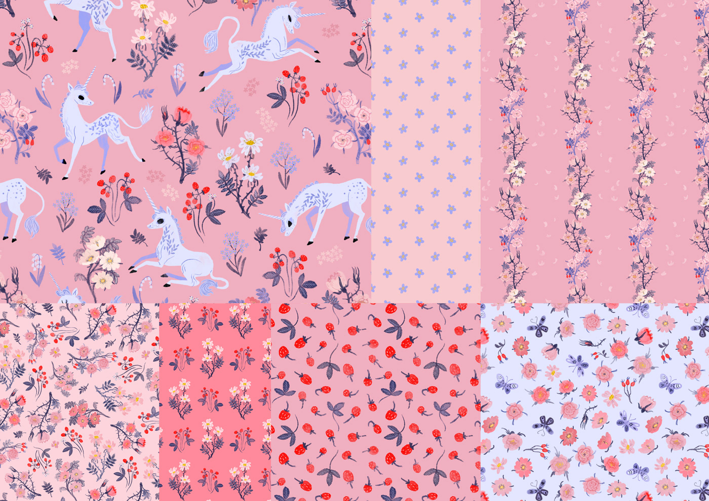 Pattern collection inspired by unicorns, roses and secret gardens.