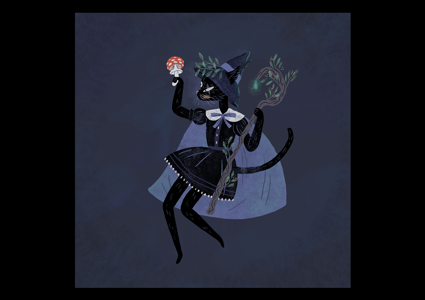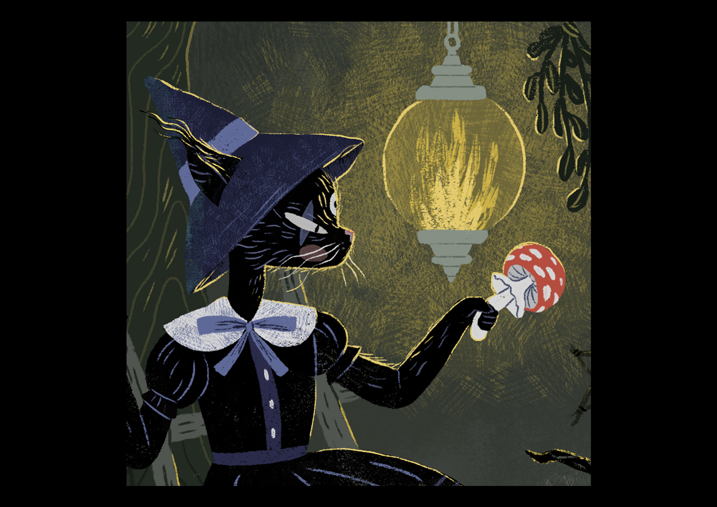 Character design and illustration of two young witches (a human and a feline one) practising in their school laboratory.